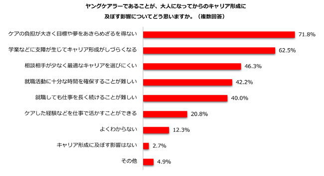 ・思うように勉強出来ず、勉強が必要な分野に行けなかったり、そもそも介護がある生活が当たり前になると、自分に可能性があることにすら気付けなくなる可能性が高いと思うので、キャリアに影響が出る人は多いと思う(勿論全員という訳ではないと思うが) (30代:正社員)