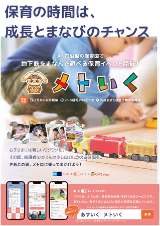 東京地下鉄株式会社(本社:東京都台東区、代表取締役社長:山村 明義、以下「東京メトロ」)、株式会社grow&partners(本社:東京都豊島区、代表取締役:幸脇 啓子、以下「grow&partners」)及び株式会社OWLedge(本社:東京都中央区、代表取締役:佐々木 優、以下「アウレッジ」)は、「地下鉄」を素材に学んで遊べる一時保育イベント「メトいく」を開催します。