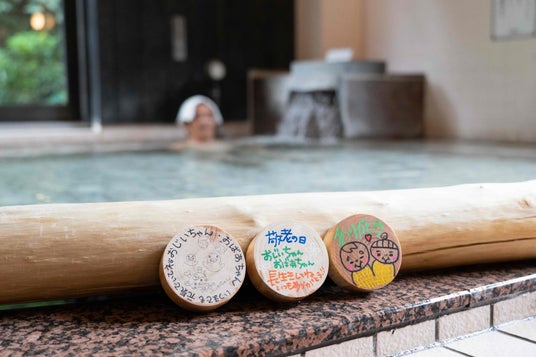 地域の子どもたちやお客さま、店舗スタッフが、おじいちゃん・おばあちゃんへの「ありがとう」の気持ちを記したヒノキの入浴木99個をおふろに浮かべます。身も心も温まったあとで「100のありがとう」を完成させるのはお客さま。残り1つのメッセージは、お客さまから大切な方へ直接伝えてください。