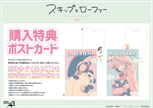 TVアニメ『スキップとローファー』新商品を含めて関連商品を1会計2,200円(税込)お買い上げごとに、購入特典としてポストカード(全2種)をランダムで1枚プレゼント。