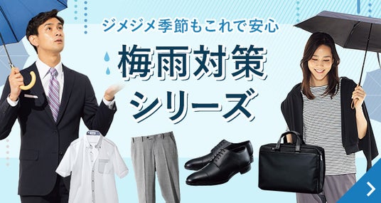 AOKIでは、梅雨の日おすすめのアイテムを多数ご用意しております。防水試験に合格したレザーを使用し靴の中の空気を循環させるシューズ、耐水性に優れ雨から書類やPCを守ってくれる大容量かつ軽量タイプのバッグ、通気性の高いシャツやスラックスなどトータルコーディネートが叶うアイテムをご用意しております。