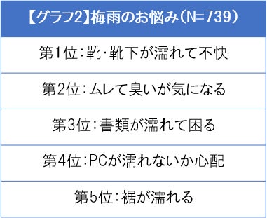 20~50代の男性約1,000名を対象にアンケート調査を実施したところ、74.0%が「梅雨の時期の通勤アイテムに悩んだことがある」と回答されました(グラフ1)。また、 「梅雨の時期の通勤アイテムで悩んだことがある」と回答した方に、具体的に「梅雨のお悩み」について質問したところ、第1位が「靴・靴下が濡れて不快」、第2位は「ムレて臭いが気になる」、第3位は「書類が濡れて困る」という結果(グラフ2)であり、梅雨の時期の通勤アイテムに関してさまざまなお悩みを抱えていることが明らかになりました。