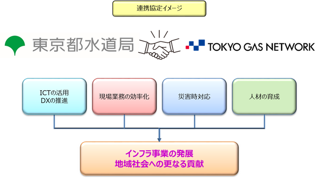 東京都水道局(局長:西山 智之)と東京ガスネットワーク株式会社(社長:沢田 聡)とは、本日、下記のとおり、インフラ事業の発展と地域社会への更なる貢献を目的とした包括連携協定(以下「本協定」という。)を締結しました。