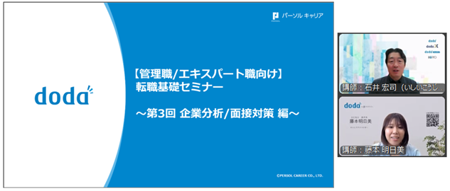 パーソルキャリア株式会社が運営する転職サービス「doda(デューダ)」は、管理職・エキスパート職の転職希望者を対象とした「転職基礎セミナー~第3回 企業分析/面接対策編~」を9月18日(木)に開催しました。ミドルシニア労働市場スペシャリストの石井 宏司と、「doda」キャリアアドバイザーの藤本 明日美が講師として登壇し、企業分析や面接対策のポイントについて解説しました。本レポートでは、その内容を一部抜粋してご紹介します。