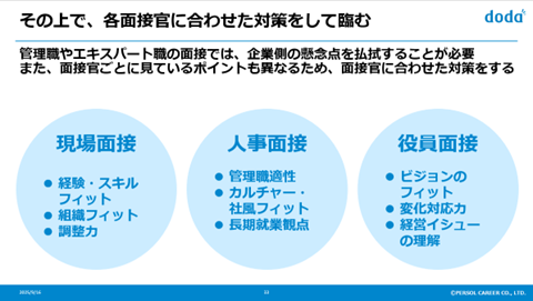 続いて「現場面接」「人事面接」「役員面接」それぞれの面接官に応じた具体的な対策を解説しました。共通して重要なことは、面接官の立場に合わせ、それぞれの懸念点が払拭できるように準備を行うことです。