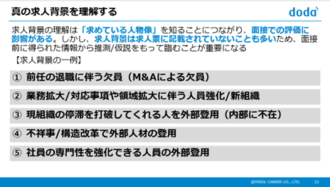 石井は「真の求人背景の把握が非常に大事」と強調しました。例えば、業務拡大による求人の場合、企業は「新しい領域に挑戦できる推進力」や「既存メンバーと協働しながら組織を成長させる力」を持つ人材を求める傾向があります。よって面接では新規プロジェクトを立ち上げた経験や、異なる部門と連携して成果を出した実績などを具体的に説明することが有効です。