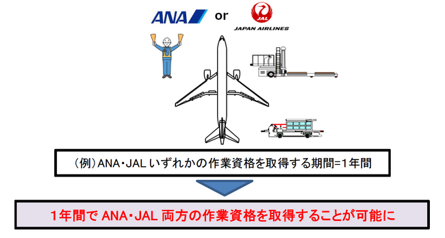 こうした作業資格をANA・JALが相互に承認することで、ANAかJALのどちらかの訓練を終了し資格を取得すれば、両社の作業に従事することができるようになるため、ANAとJAL双方の便をハンドリングする事業者における訓練に必要な日数の削減などの効率化につなげ、繁忙を緩和することを目指します。