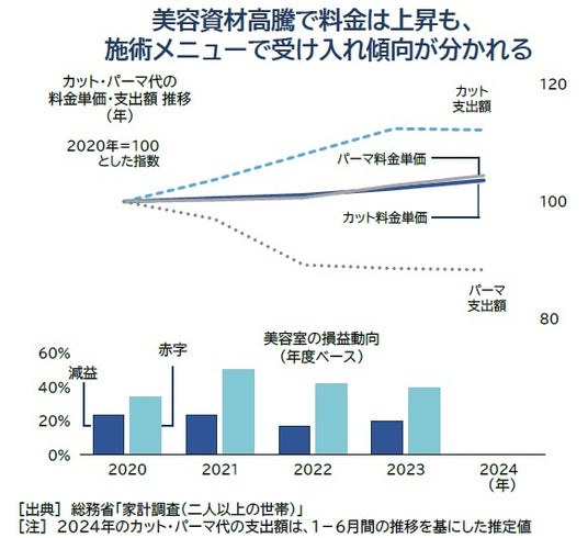 また、物価高による家計の節約志向に加え、女性のヘアスタイルの流行が洗髪しやすいショートカット系へとシフトし、「カットは好調だがパーマネントなど高単価の施術メニューが厳しい」といった声も聞かれた。実際に、支出額ベースではカットに比べてパーマネントの減少傾向がみられた。