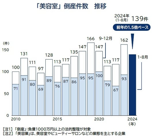 美容室の淘汰が加速している。2024年に発生した美容業(美容室)の倒産(負債1000万円以上、法的整理)は、8月までに139件発生した。23年の同期間に比べて約1.5倍となったほか、年間で最多だった2019年(166件)を大きく上回る勢いで推移している。このペースが続いた場合、通年の倒産件数は過去最多を大幅に更新し、初めて年間200件台に到達する可能性がある。