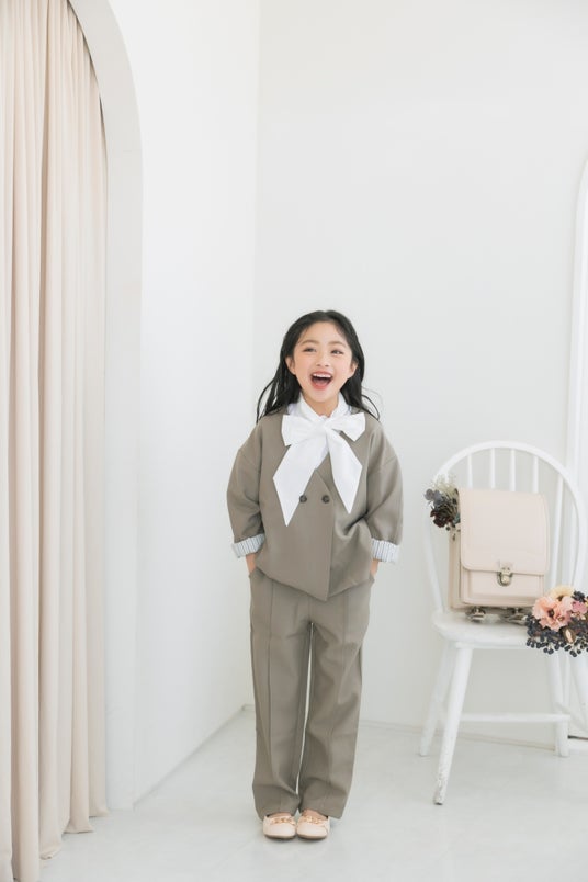 入学式本番の女の子衣装は「フォーマルなワンピース」が定番ですが、前撮りや後撮りならではのスタイリングのご提案。“大人っぽいのに、どこかキュート”バランスが絶妙なNEW STYLINGです。
