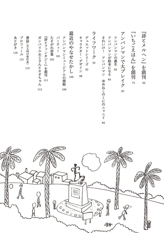 生い立ちから、雑誌「詩とメルヘン」出版、名曲「てのひらを太陽に」など作詞家としての功績、そして世紀のヒーロー「アンパンマン」誕生。貴重なイラスト作品も多数収録し、多彩かつ膨大な仕事の全貌を一冊に凝縮。