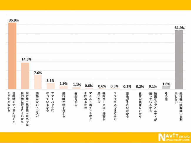 「交通手段として、飛行機(旅客機)を選ぶ1番の理由は何ですか?」という質問については、「目的地まで、早く行くことができるから」が35.9%、「飛行機(旅客機)以外では目的地に行きにくいから」が14.3%、「価格が安い・コスパ」が7.6%人という順になりました。