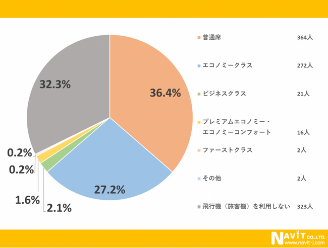 「どの座席を利用することが最も多いですか?」という質問では、「普通席」が最多で36.4%、次いで「エコノミークラス」が27.2%という結果でした。その後は「ビジネスクラス」が2.1%、「プレミアムエコノミー・エコノミーコンフォート」が1.6%と、上位2つを一気に引き離す結果となりました。やはり、「ビジネスクラス」以上のグレードになると、利用される方は少ないようですね。