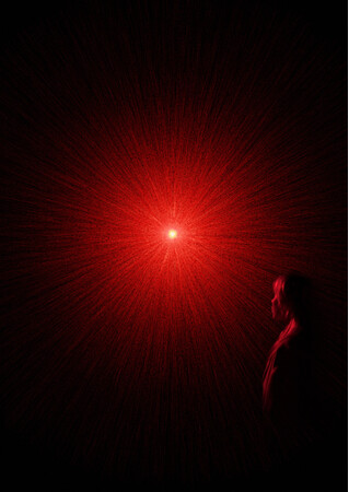 《我々の中にある巨大火花》は、細い光の線が中心から放射状に無数に広がり、球体を形作ります。球体に触れようとすると、球体は反応しますが、物理的な境界がないため、手は球体の中に入ります。