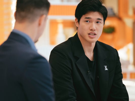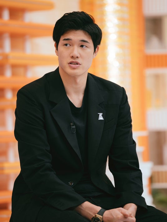 キャリア第2 章を迎える渡邊選手は、上下黒のジャケットに、下ろしたてというスニーカー姿で登場。時折、笑顔を見せながら、B リーグでプレーすることになった今の気持ちや決意、さらには番組アンバサダーとしての意気込みなどを語ってくれました。