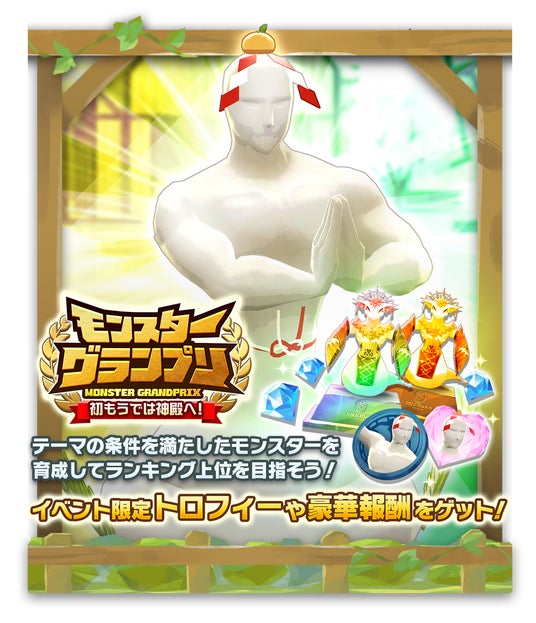 「モンスターグランプリ 初もうでは神殿へ!」を開催します。前半、後半で3つずつ用意されたテーマに沿ってモンスターを育成完了し、「いいね(総合力を元にしたポイント)」でランキングを競います。月の前半、後半を合算した総合ランキングにより獲得できる専用トロフィーには総合ランキングの順位が保存され、いつでも確認することができます。イベントの詳細はゲーム内にてご確認ください。