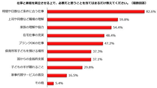両立に最も必要なのは「条件に合う仕事」82.6%、「両立しながらキャリアの発展可」21.2% ~しゅふJOB総研調査~