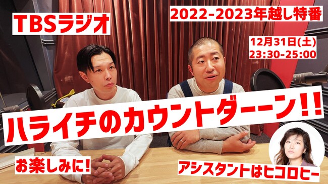 また、アシスタントをヒコロヒーが務め、ハライチと共に年越しカウントダウンを盛り上げます。明けて2023年に新しい目標を掲げたリスナーと、生放送で時を共有し、メールや電話を交えて応援していきます。