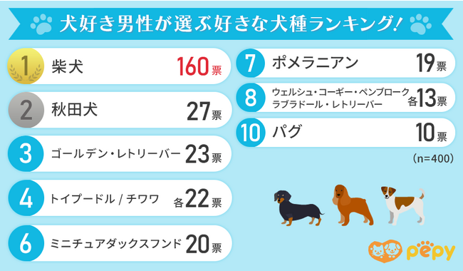 株式会社NEXER(本社:東京都豊島区)の100%子会社であるpepy株式会社(本社:東京都豊島区)は、ペットを愛する人のためのお役立ち情報を発信するメディア『pepy』にて、犬好きな男性400人を対象に『好きな犬種』についてアンケートを実施しその結果をサイト内にて公開しました。