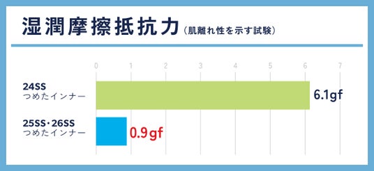 汗でぬれた際の生地の「肌離れ性」を示す数値(湿潤摩擦抵抗力)が、従来の6分の1以下に改善。汗をかいても、生地が肌にはりつきにくく、スッと離れるさらっとした着心地をキープします。