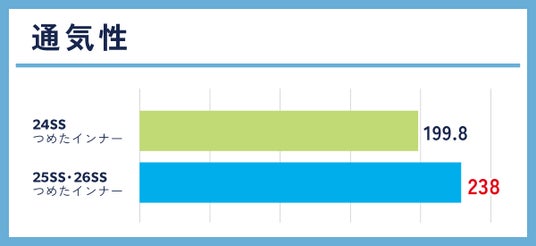 薄手のメッシュ素材を採用し、当社従来品(2024年発売)と比較して1.4倍以上の通気性を実現。熱がこもりにくく、運動中も涼しさが継続します。