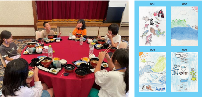 ヒラメの勉強をした後は、実際にヒラメを食べてみました。新鮮なヒラメは歯ごたえがあり食べ応えがありました。ヒラメの事を学んだ後に食べると命のありがたみを実感し、子供たちは残さず全てたいらげていました。その後、今回の調査団で学んだ事をアウトプット商品にする為のまとめ授業に入りました。今回制作したのは、海の恵みをたっぷり含んだ「魚粉のオリジナルパッケージ」です。子供たちが2泊3日で学んだ事を一つの絵にして制作します。1日目の白神山地の散策で学んだ事、秋田県の県魚ハタハタの生息する海、青森県の県魚ヒラメが食べるプランクトン豊富な豊かな海などの4つのグループに分かれてそれぞれが考えたものを絵表現してもらい、最終的に4種類の絵にしました。この絵を使って「贅沢魚粉 海プロオリジナルパッケージ」として販売します。