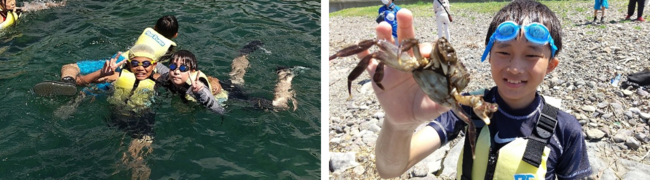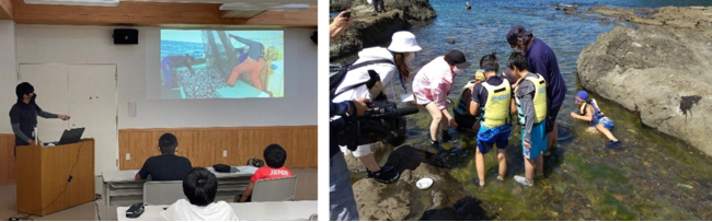 秋田県の県魚ハタハタを学ぶ座学では、秋田県水産振興センターの佐藤滉平さんを講師にハタハタの基本知識となぜ八峰町で昔からハタハタがたくさん獲れていたのかを学びました。八峰町の近海では白神山地からのミネラルたっぷりの水のおかげでハタハタが卵を産み付ける海藻「ホンダワラ」がたくさん育つ環境がある事を知りました。座学の後には実際に海に入る体験を実施し、海藻を触ったり巻貝やカニなどの海の生き物を探したりしました。少しの時間でたくさんの生き物を見つけた子供たちは、白神山地の恵みが日本海を豊かにしている事を実感しました。