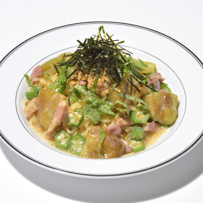 焼き茄子の香ばしさと、やわらかな風味の納豆や旬のオクラが絶妙に絡み合うパスタ。本格イタリア産パンチェッタで上品な旨味をプラスしました。