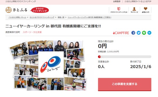 長野県御代田町とふるさと納税ポータルサイト「さとふる」を運営する株式会社さとふる(本社:東京都中央区、代表取締役社長 兼 CEO:藤井 宏明)は、「さとふるクラウドファンディング」にて、「ニューイヤーカーリング in 御代田 有観客開催にご支援を!!」の寄付受け付けを2024年11月15日より開始します。