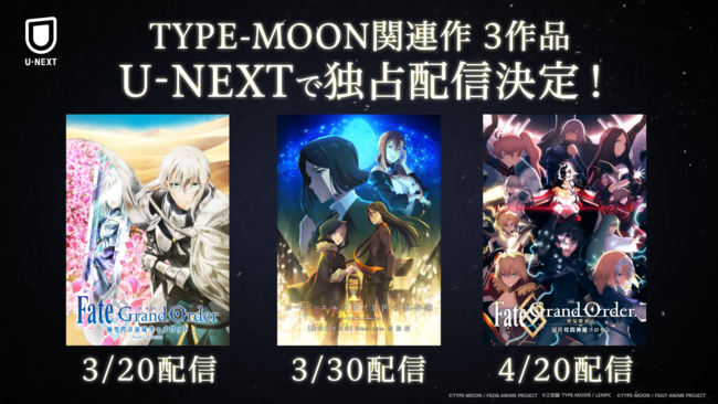 USEN-NEXT GROUPの株式会社U-NEXT(本社:東京都品川区、代表取締役社長:堤 天心)が運営する動画配信サービス「U-NEXT」は、3月20日(日)より『劇場版 Fate/Grand Order -神聖円卓領域キャメロット- 後編 Paladin; Agateram』を皮切りに、『ロード・エルメロイII世の事件簿 -魔眼蒐集列車 Grace note- 特別編』、『Fate/Grand Order -終局特異点 冠位時間神殿ソロモン-』の3作品を独占配信いたします。