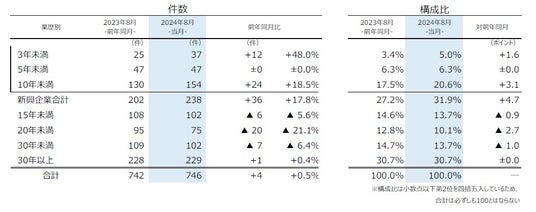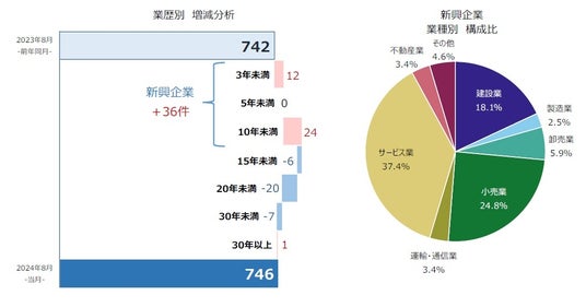 業歴10年未満の『新興企業』(「3年未満」〈前年同月25件→37件、48.0%増〉、「5年未満」〈同47件→47件〉、「10年未満」〈同130件→154件、18.5%増〉)は238件(前年同月202件、17.8%増)だった。30カ月連続で前年同月を上回り、2000年以降で最長の増加期間となった。内訳を業種別にみると、「サービス業」(同70件→89件、27.1%増)が最多、「小売業」(同43件→59件、37.2%増)、「建設業」(同34件→43件、26.5%増)が続いた。