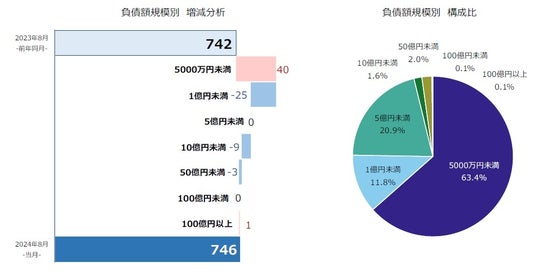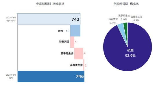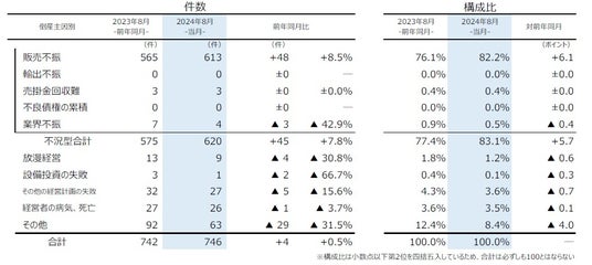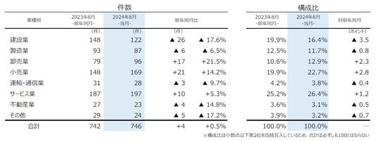 - 倒産件数は746件(前年同月742件、0.5%増)と、28カ月連続で前年同月を上回った。8月としては、前年(742件)を超え、過去10年で最多となった