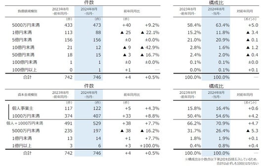 資本金規模別にみると、『個人+1000万円未満』の倒産が529件(前年同月491件、7.7%増)となり、全体の70.9%を占めた。