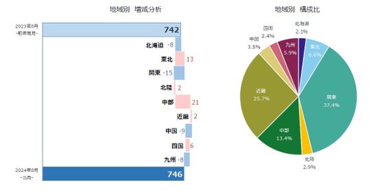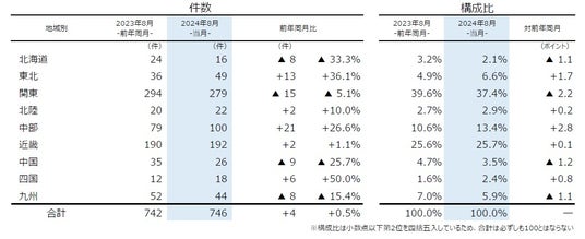 - 地域別にみると、9地域中5地域で前年同月を上回った。最も件数が多かった『関東』(前年同月294件→279件、5.1%減)は19カ月ぶりに前年同月を下回った。最も増加率が高かったのは『四国』(前年同月12件→18件、50.0%増)で、5カ月ぶりに50%以上の増加率となった。2024年1-8月の累計では、すでに5県が2023年通年の件数を上回った