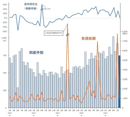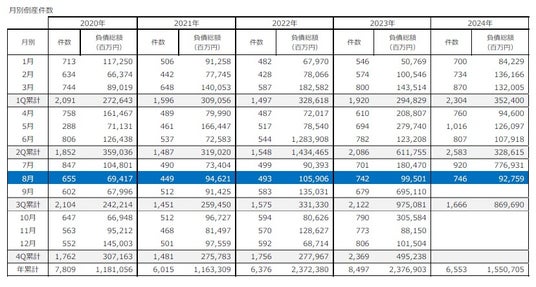 株式会社帝国データバンクは、2024年8月の企業倒産件数(負債1000万円以上の法的整理が対象)について集計し、分析を行った。