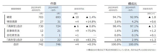 倒産態様別にみると、『清算型』倒産は724件(前年同月730件、0.8%減)となり、全体の97.1%(対前年同月1.3ポイント減)を占めた。『再生型』倒産は22件(同12件、83.3%増)発生し、2カ月連続で前年同月を上回った。