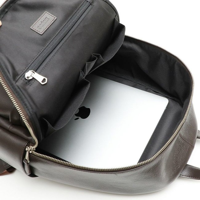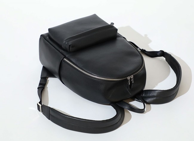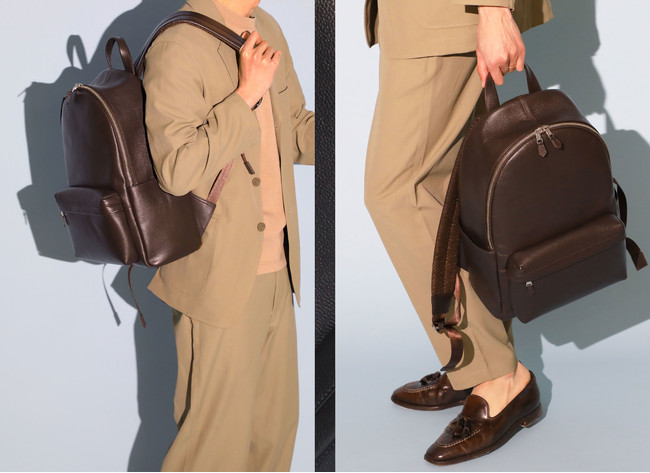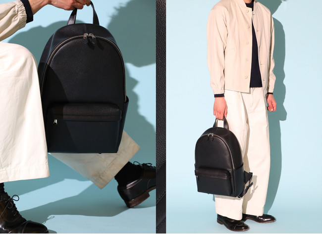 無駄な装飾や外付けポケットの少ないシンプルな見た目のバックパックがドレスシーンでのセットアップやカジュアルな日常スタイルのワイドパンツにも合わせることができる。またレザーの上質な風合いがスタイリングを寄り際立て、上品で清潔感のある印象になります。