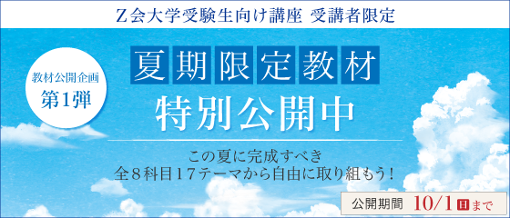 Z会の大学受験生向け講座をお申し込みされる方へ、特典として夏に完成させたいテーマを8回で短期攻略できる夏期限定教材を特別公開します。全8科目17テーマから必要なものをすべて選んでお取り組みいただけます。