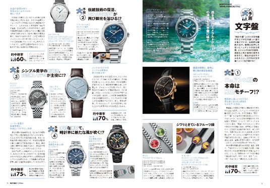 「時計のサイズはこれから小さくなる?」「どんな素材が出てきそう?」「ムーブメントの最新傾向は?」など、テーマごとに高級時計の未来を、確定率と合わせて検証! コラムでは時計界全体の予測を時計ジャーナリストの並木浩一氏と世界最大の時計マーケットプレイス「Chrono24」記者が考察し、編集部はロレックスの次なる新作を大胆予測しています。