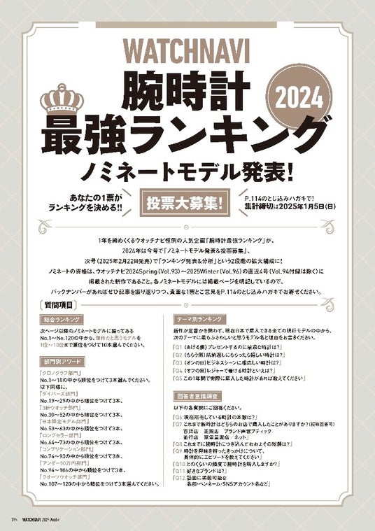 例年11月発売号に掲載していた「腕時計最強ランキング」をリニューアル。今号にてノミネートモデル全120本を公開し、集計結果を2025年2月20日発売号で発表します。投票はどなたでも可能ですので、推しのブランドが上位に入るよう奮って投票ください!!