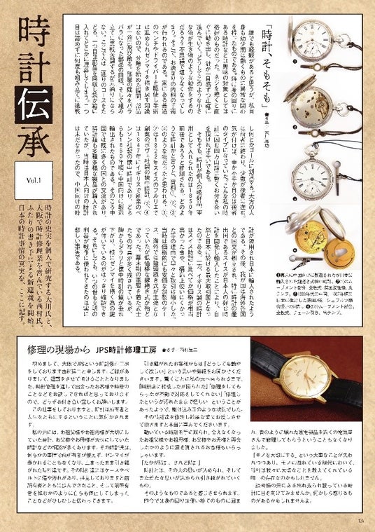 今号からの新連載となる「時計伝承」では、日本の輸入時計の歴史を個人で研究する大川氏と大阪で時計修理工房「JPS」を営む西村氏という、ふたりの書き手が日本の時計事情の真実を綴っていきます。