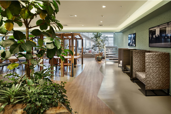 「ターミナル」をコンセプトに仕上げた新たなオフィス。180坪の解放感ある広いスペースに、グリーンを多用し、複数のマテリアルを組み合わせながら全体ではナチュラルな雰囲気に仕上げています。ワールド北青山ビル14階と同様に(株)アスプルンドの家具を配置し、デスク、ソファー席、コミュニケーションスペース、集中ができるリモートワークブースまで用途で選べる多彩な構成です。