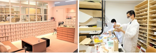 創業73年の老舗シューズメーカー、神戸レザークロスの東京オフィスに併設したカスタムオーダーハイヒールブランド「gauge(ゲージ)」のラボ。お客様はソファーに座りながら、ご自身のシューズの採寸と購入後のアフターケアが受けられます。全体を「エスペランサ」の店舗イメージ同様にピンクベージュで仕上げ、靴箱を重ねたような収納や様々な型や素材見本もインテリアの一部として整然と配置することで、心地よく包まれるような空間に。奥には靴の原型をつくる「木型師」の工房を設置。ガラス張りにすることで、ものづくりの空間をオーダースペースからご覧いただける、シューズブランドならではの設計です。