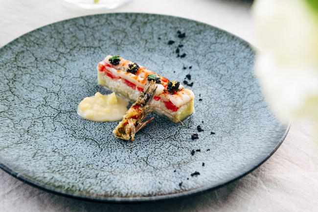 久米島産クルマエビと信州産ナスのプレッセ アップルハニージンジャーソース