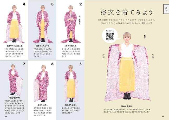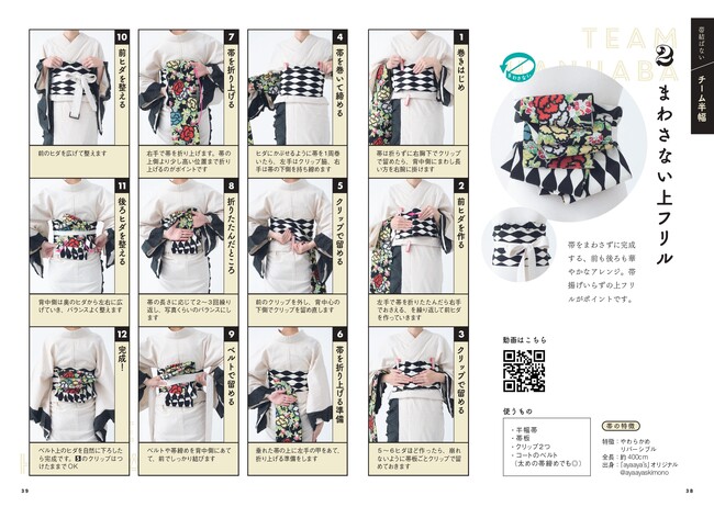 刊行から瞬く間に重版となった前作『帯結ばない帯結び』では着物を扱いましたが、今作では「浴衣」も特集し、「帯結ばない帯結び」の新作32種類をお届けします。初めての人でもキレイに浴衣を着られるよう、着付けの基本から丁寧にご案内。ページのQRコードを読み込むことで、わかりやすい解説動画を見ることもできます(一部)。