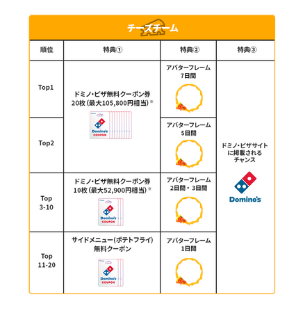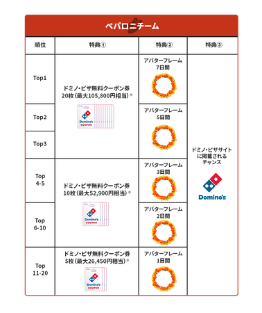 「マイドミノコラボキャンペーン」では、イベント期間中にリリースされるドミノ・ピザとのコラボギフトの獲得や動画投稿を踏まえて計算されるポイント数によりランキング順位が決まり、上位入賞者にはドミノ・ピザで使える最大105,800円分※のドミノ・ピザ20枚分の無料券やTikTok LIVEのプロフィールを装飾するアプリ内コラボアイテムなどの豪華特典を贈呈します。また、入賞者の中から選ばれた5名はドミノ・ピザの公式サイトに掲載されるチャンスも!