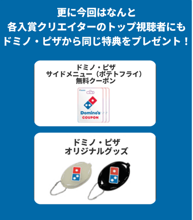 更に今回はなんと各入賞クリエイターのTop視聴者にもドミノ・ピザから特典をプレゼント!