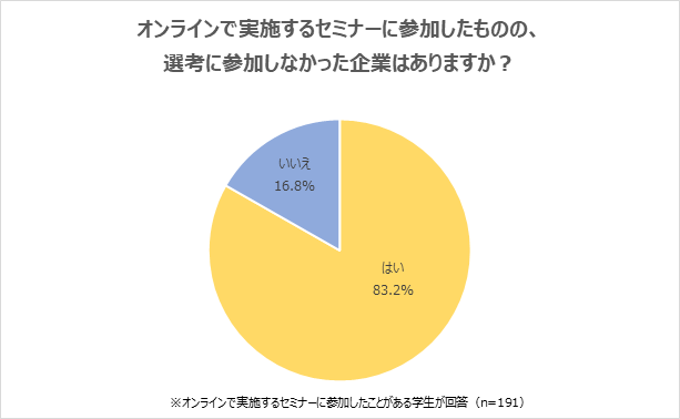「オンラインで実施するセミナーに参加したものの、セミナーに参加しなかった企業がある」と回答した学生が83.2%に上りました。多くの学生がセミナーに参加後に、選考に参加しなかった経験を持つことが分かります。「リアルで実施するセミナーに参加したものの、選考に参加しなかった企業がある」の回答(70.9%)を12.3ポイント上回りました。オンライン開催のセミナーは、リアル開催のセミナーと比較すると、その後の選考に参加しなかった経験を持つ学生が多いことが分かります。