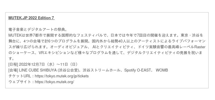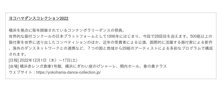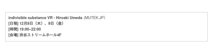 28回目を迎える今回のヨコハマダンスコレクション2022のテーマは「ダンスとテクノロジー」。イタリアを拠点に活動し、2022年11月にはメキシコのMUTEK.MXでインスタレーション作品を発表するなど、世界のデジタルアート界で注目のマルチディシプナリー・アート・スタジオfuse*のパフォーマンス作品を上演します。また梅田宏明の新作 『indivisible substance』 は、ヨコハマダンスコレクションでオンラインと劇場での上演、MUTEK.JPではVRプログラムとして展開、これまでにない多面的な鑑賞体験を観客に提案します。2022年12月はダンスとデジタルアートに注目です。