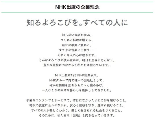 NHK出版は、企業理念「知るよろこびを。すべての人に」のもと、これからもすべての人が知るよろこびと出会える社会づくりに「出版」を通して貢献していきます。
